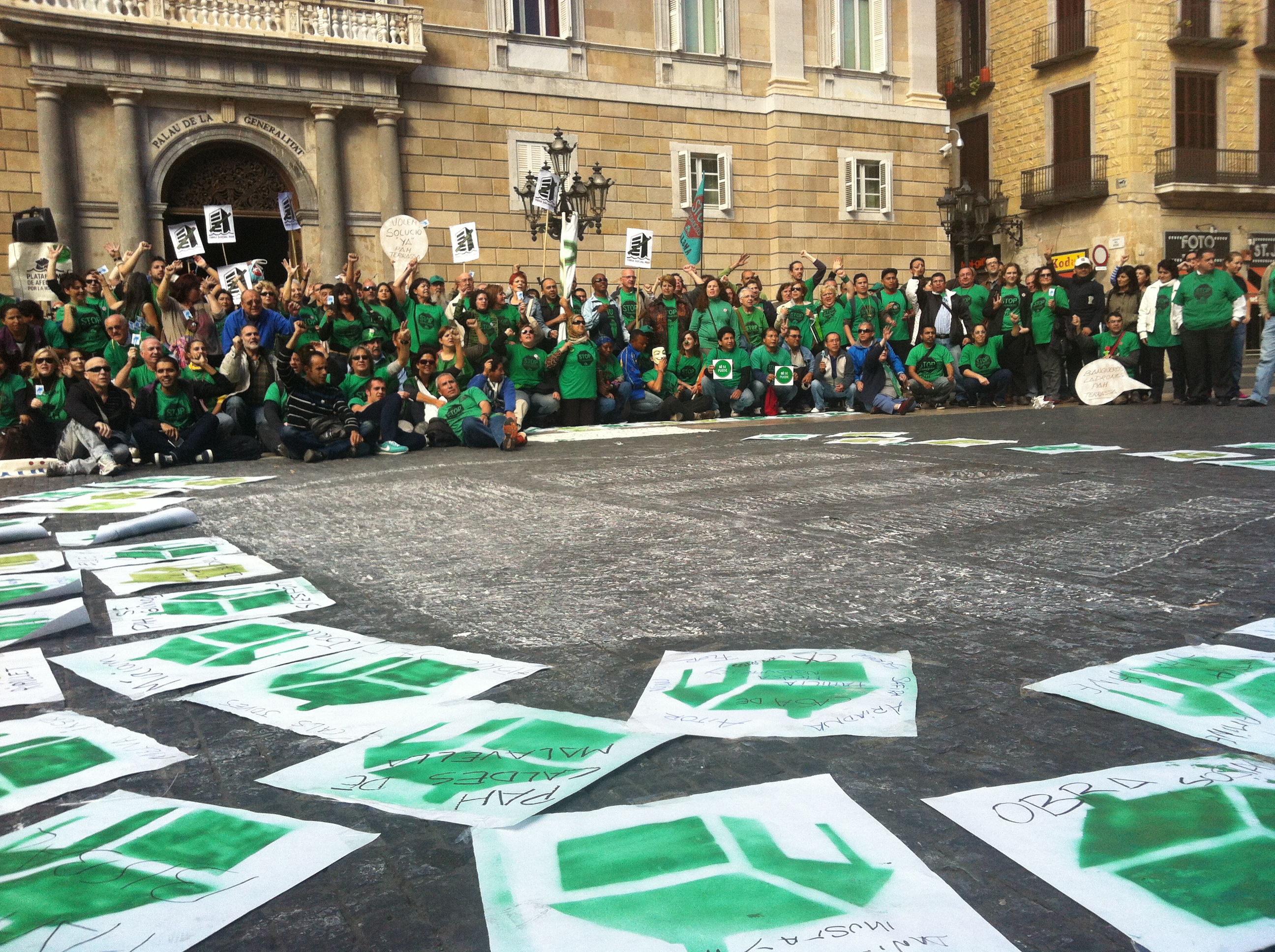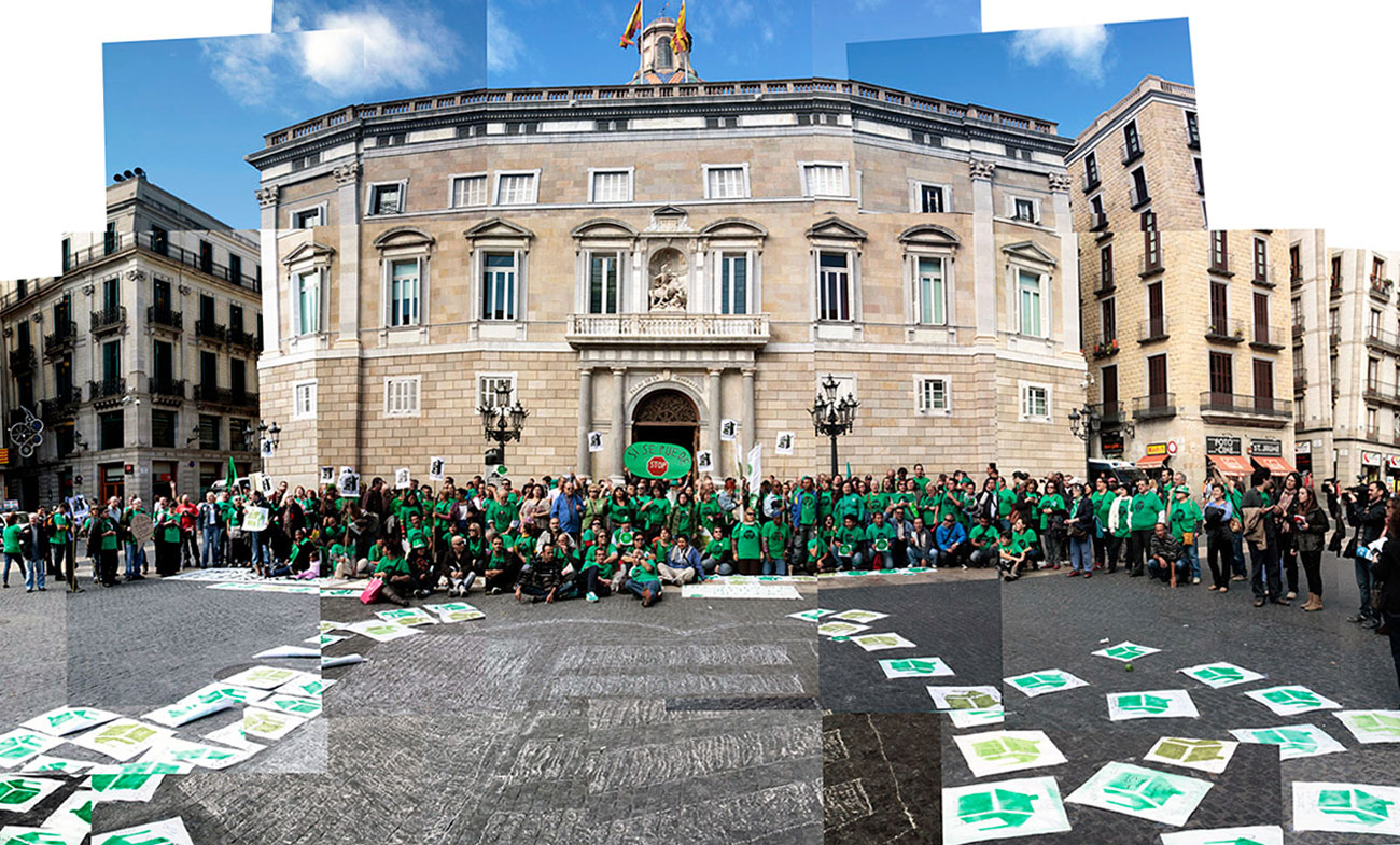 Por este motivo hoy en Barcelona, en una acción que buscaba visibilizar esa realidad que Gobiernos y bancos esconden, se han construído centenares de pequeñas casitas con nombres y apellidos reales dentro. Además había representación de los edificios recuperados en varias poblaciones de Catalunya.