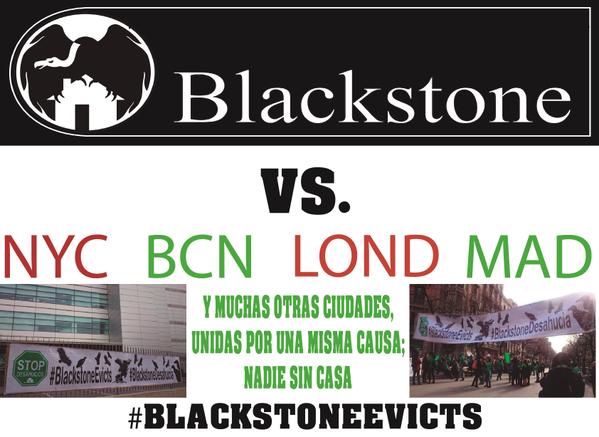 Blackstone es el mayor fondo buitre del mundo, llegando a gastar hasta 100 millones de dólares a la semana en la compra de propiedades ejecutadas en EE.UU. Sin ningún tipo de responsabilidad social, Blackstone se dedica a la compra de propiedades devaluadas de las que posteriormente aumenta el precio de alquiler. De este modo coloca sistemáticamente a todas las familias que residen en dichas viviendas en peligro de desahucio y extrema vulnerabilidad. En otras palabras, Blackstone es líder internacional en el enriquecimiento por desposesión, poniendo centenares de vidas en juego para aumentar su margen de beneficios.