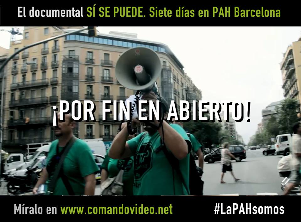Comando Video te invita a ver el documental ‘SÍ SE PUEDE. Siete días en PAH Barcelona’ (2014) donde se muestra el día a día de la Plataforma de Afectados por la Hipoteca de Barcelona en lo que podría ser una semana cualquiera en su incansable actividad.