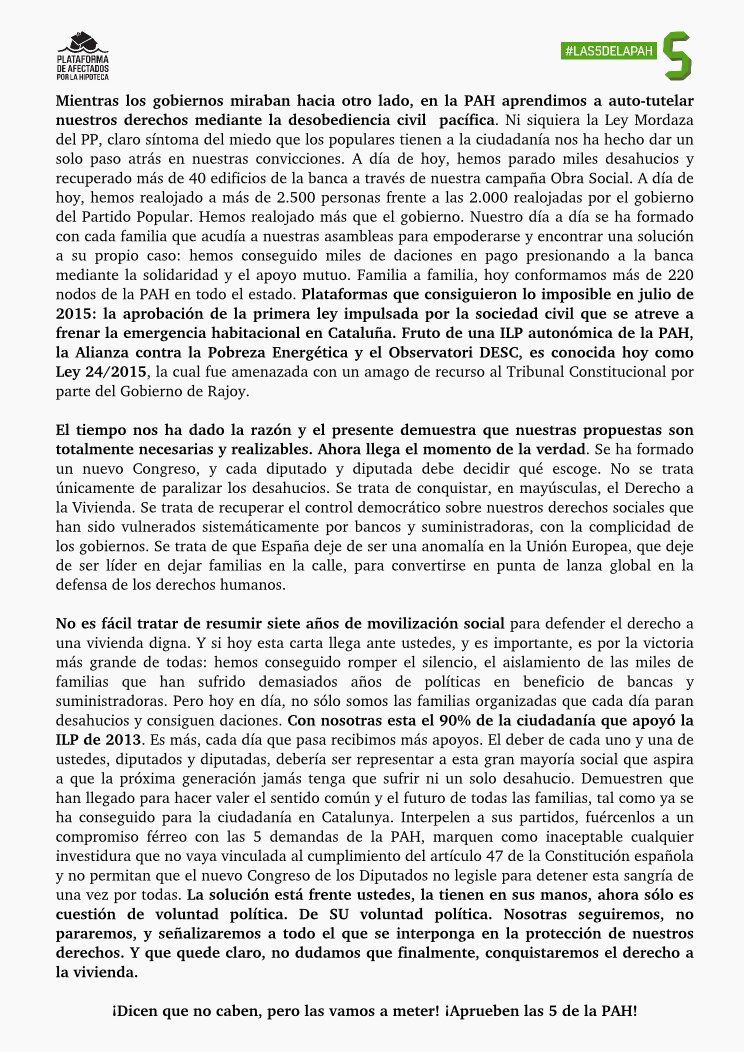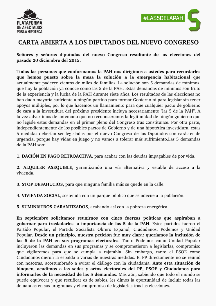 Desde la PAH redactamos una carta abierta para los diputados y diputadas del nuevo Congreso, poniendo sobre la mesa 5 exigencias que conquistarán el Derecho a la Vivienda. Tras siete años de lucha imparable acumulando miles de pequeñas grandes victorias, la PAH sigue recordando la necesidad de acabar con la sangría de desahucios y cortes de suministros que sufren cientos de miles de familias innecesariamente. Con nuestras 5 exigencias, no solo las familias que acuden a la PAH tendrían garantizado techo, agua y luz. Esta sería una garantía para todas las familias, para todas las ciudadanas. Lanzamos un órdago a todos los nuevos miembros del Congreso, para que obliguen a sus partidos a recoger las 5 demandas y ponerlas como una condición indispensable en cualquier posible pacto de gobierno. Hablamos de vidas en juego. Y rescatarlas es solo cuestión de voluntad política. Desde la PAH lo tenemos muy claro. No pararemos hasta que se protejan nuestros derechos sociales y cada familia tenga un hogar. Y seguiremos movilizándonos, contra quien haga falta, convencidos de que 2016 será el año donde las 5 exigencias de la PAH se hagan realidad.
