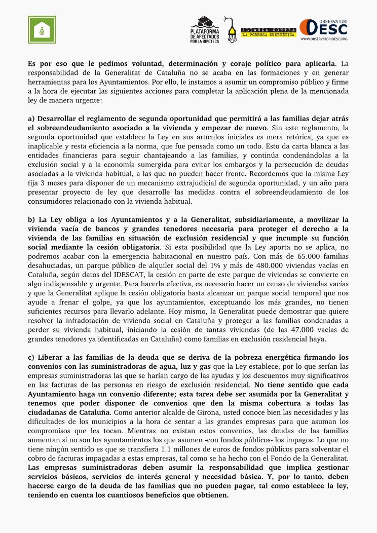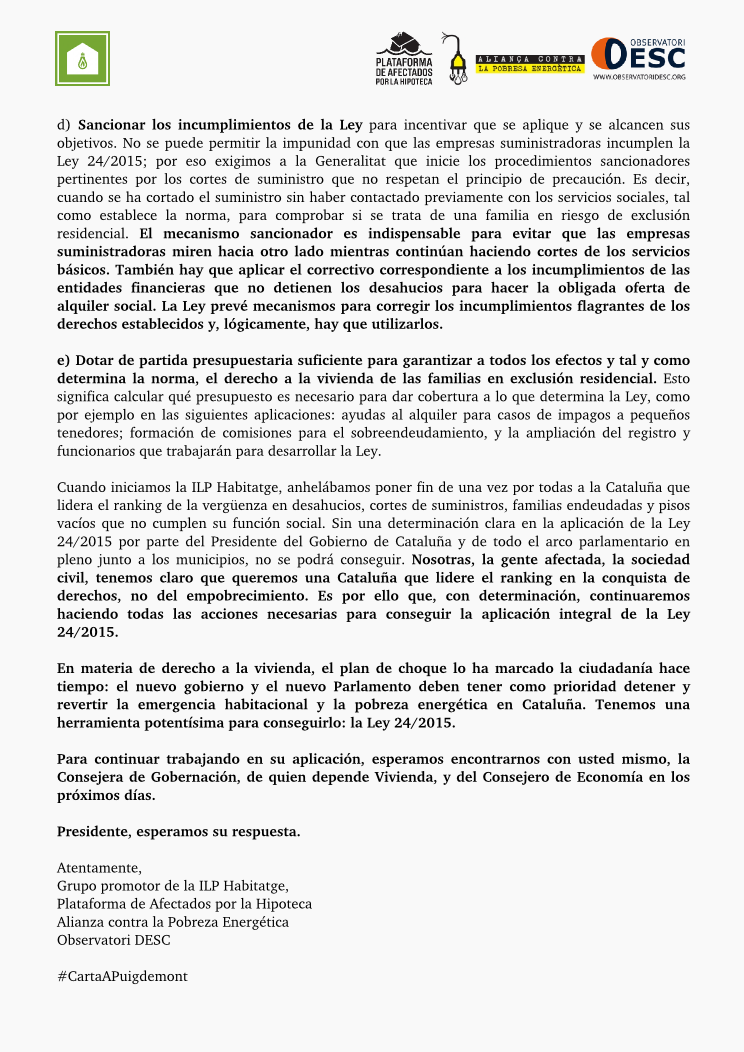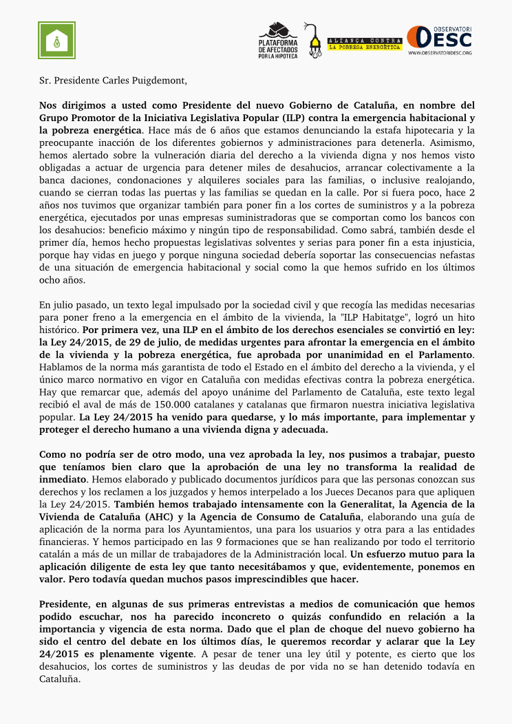 Nos dirigimos a usted como Presidente del nuevo Gobierno de Cataluña, en nombre del Grupo Promotor de la Iniciativa Legislativa Popular (ILP) contra la emergencia habitacional y la pobreza energética. Hace más de 6 años que estamos denunciando la estafa hipotecaria y la preocupante inacción de los diferentes gobiernos y administraciones para detenerla. Asimismo, hemos alertado sobre la vulneración diaria del derecho a la vivienda digna y nos hemos visto obligadas a actuar de urgencia para detener miles de desahucios, arrancar colectivamente en la banca daciones, condonaciones y alquileres sociales para las familias, o inclusive realojando, cuando se cierran todas las puertas y las familias se quedan en la calle. Por si fuera poco, hace 2 años nos tuvimos que organizar también para poner fin a los cortes de suministros y a la pobreza energética, ejecutados por unas empresas suministradoras que se comportan como los bancos con los desahucios: beneficio máximo y ningún tipo de responsabilidad. Como sabrá, también desde el primer día, hemos hecho propuestas legislativas solventes y serias para poner fin a esta injusticia, porque hay vidas en juego y porque ninguna sociedad debería soportar las consecuencias nefastas de una situación de emergencia habitacional y social como la que hemos sufrido en los últimos ocho años.