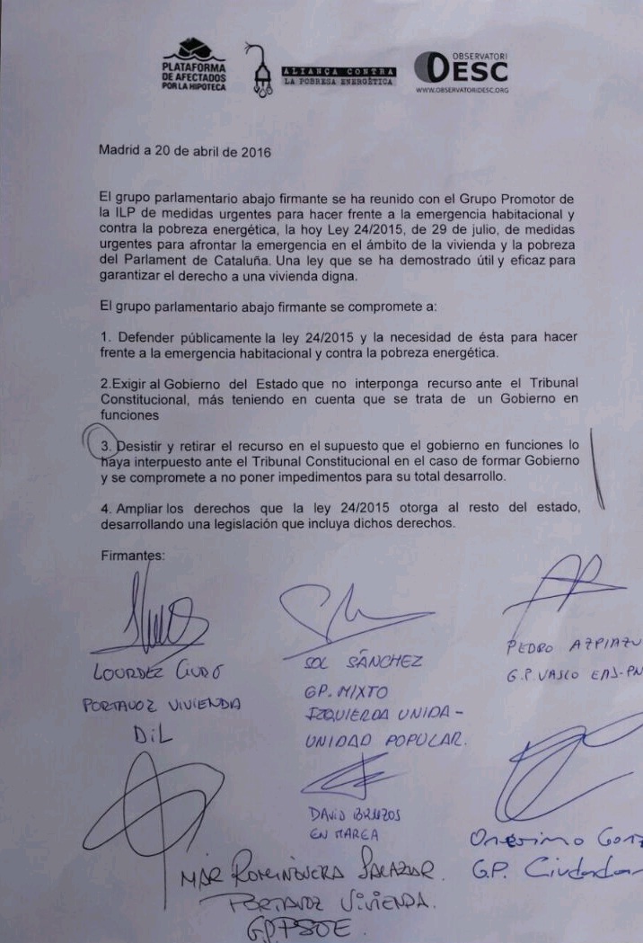 Con este mismo objetivo que, a lo largo del día de hoy el Grupo Promotor de esta ley amenazada, formado por la Plataforma de Afectados por la Hipoteca (PAH), la Alianza Contra la Pobreza Energética (APE) y el Observatorio DESC; nos reuniremos con los grupos parlamentarios para que dejen por escrito su compromiso público de defender y proteger la Ley 24/2105. Adjuntamos la agenda de las reuniones: