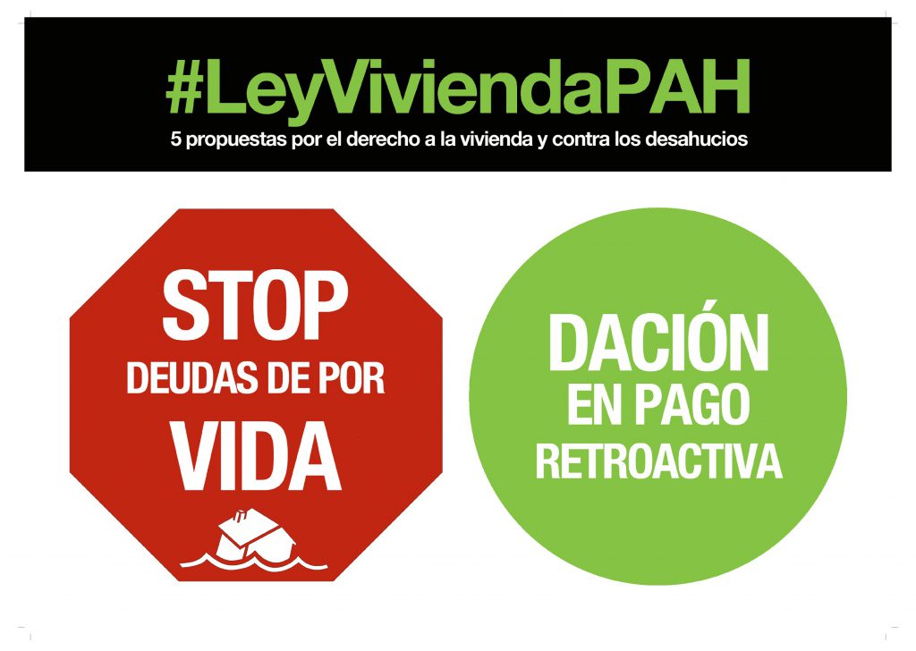 Hasta ahora la ciudadanía ha prevenido el desastre antes de que ocurriera, organizándonos en la PAH para combatirlo mientras las Administraciones Públicas miraban hacia otro lado. Y desde el principio fuimos propositivas, poniendo sobre la mesa la dación en pago, como mecanismo que posibilitará eliminar toda la deuda hipotecaria a cambio de la entrega del bien hipotecado, la práctica más común en el resto de la Unión Europea. Y exigimos que sea retroactiva, para que se aplique a todas las familias que habían pasado por una ejecución hipotecaria, y que, tras perder su vivienda, mantienen de por vida una deuda impagable que les condena a vivir en la economía sumergida. Con este ánimo presentamos en 2013 una ILP que recogió un millón y medio de firmas, que contenía tres demandas: dación en pago retroactiva, alquiler social y moratoria de los desahucios.