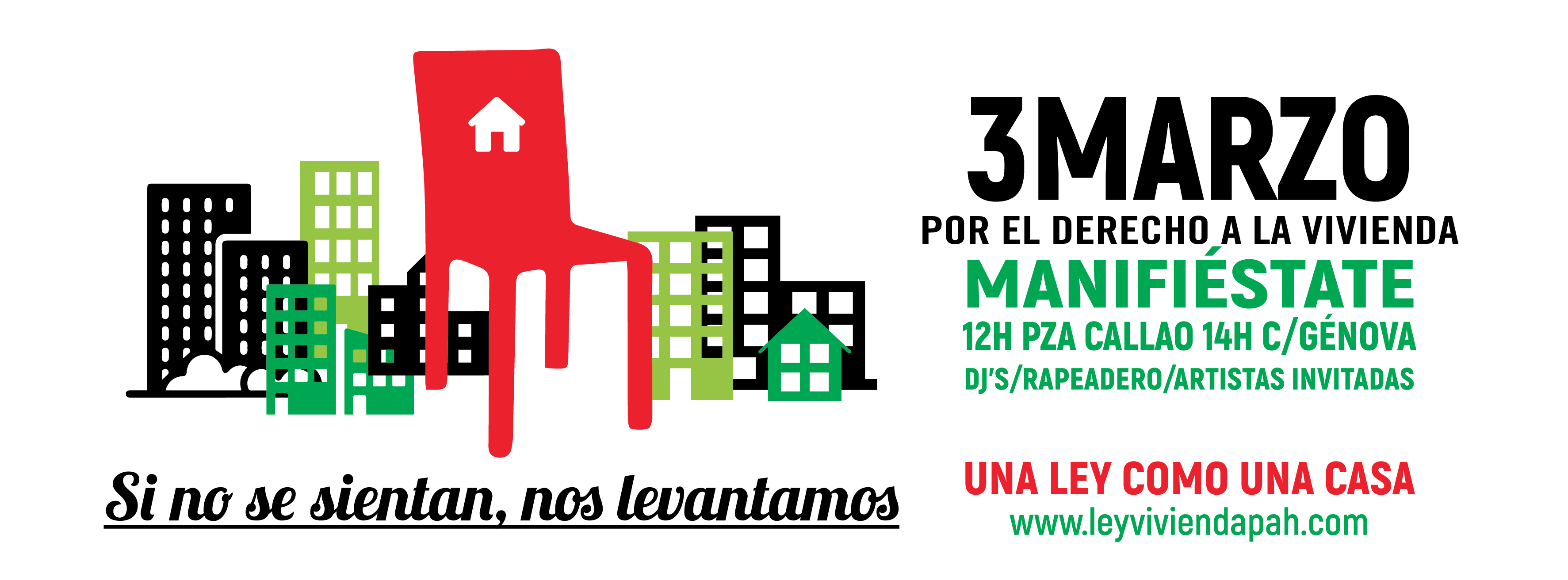 Una vez registrada esta Ley de Vivienda PAH en el Congreso, estamos a la espera de que el Partido Popular no la vete y vuelva, de nuevo, a tumbar las ilusiones y el derecho a techo de miles de familias. Es hora de decirle al Partido Popular que ya BASTA, por eso os invitamos a todas el próximo 3 de marzo a la GRAN MANIFESTACIÓN que estamos preparando en Madrid.