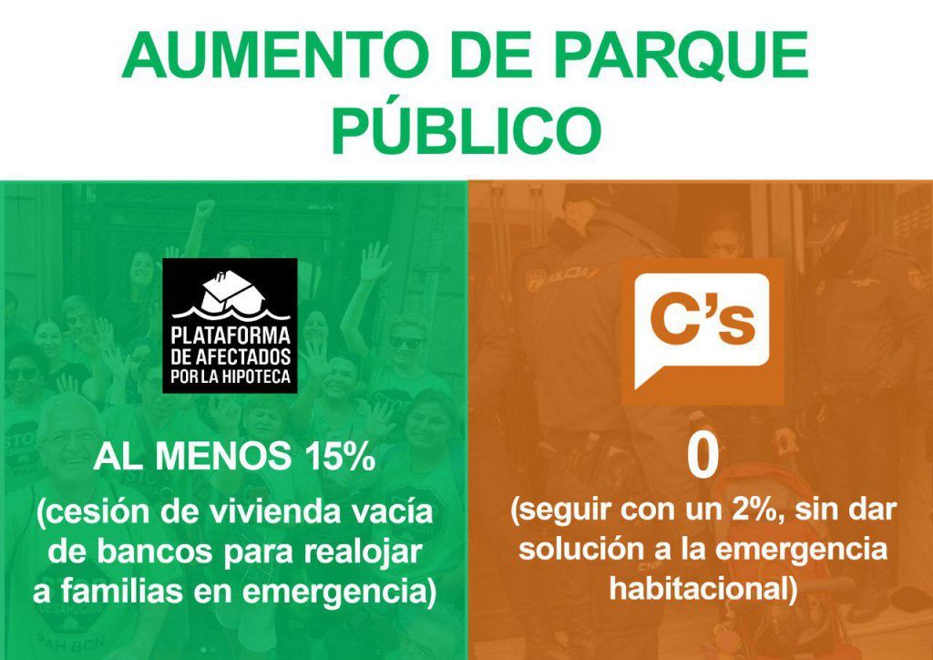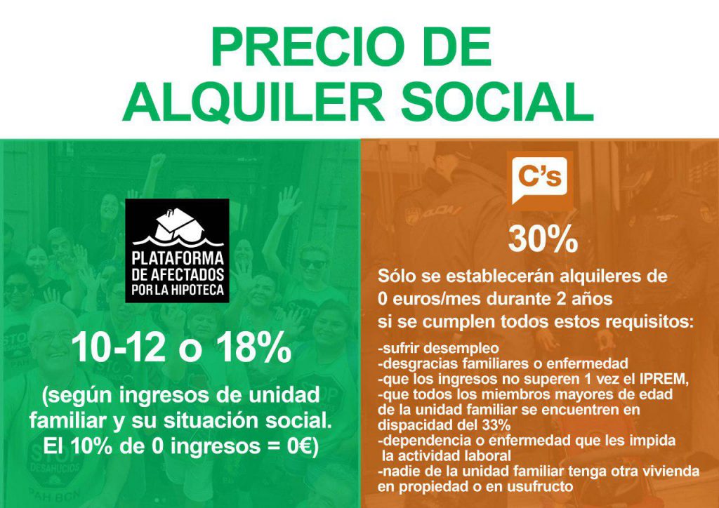 Plataformas en municipios de todo el Estado, nos movilizaremos esta semana frente a las sedes de Ciudadanos interpelando para que voten a favor de la tramitación de la Ley Vivienda PAH en la Mesa del Congreso. El pasado viernes, 16 de febrero, el Partido Popular solicitó un veto a la Ley Vivienda PAH: una propuesta de ley que de legislarse acabaría con los desahucios, las subidas abusivas de los alquileres, los cortes de suministros y ampliaría el parque público de vivienda equiparándolo a la media europea.