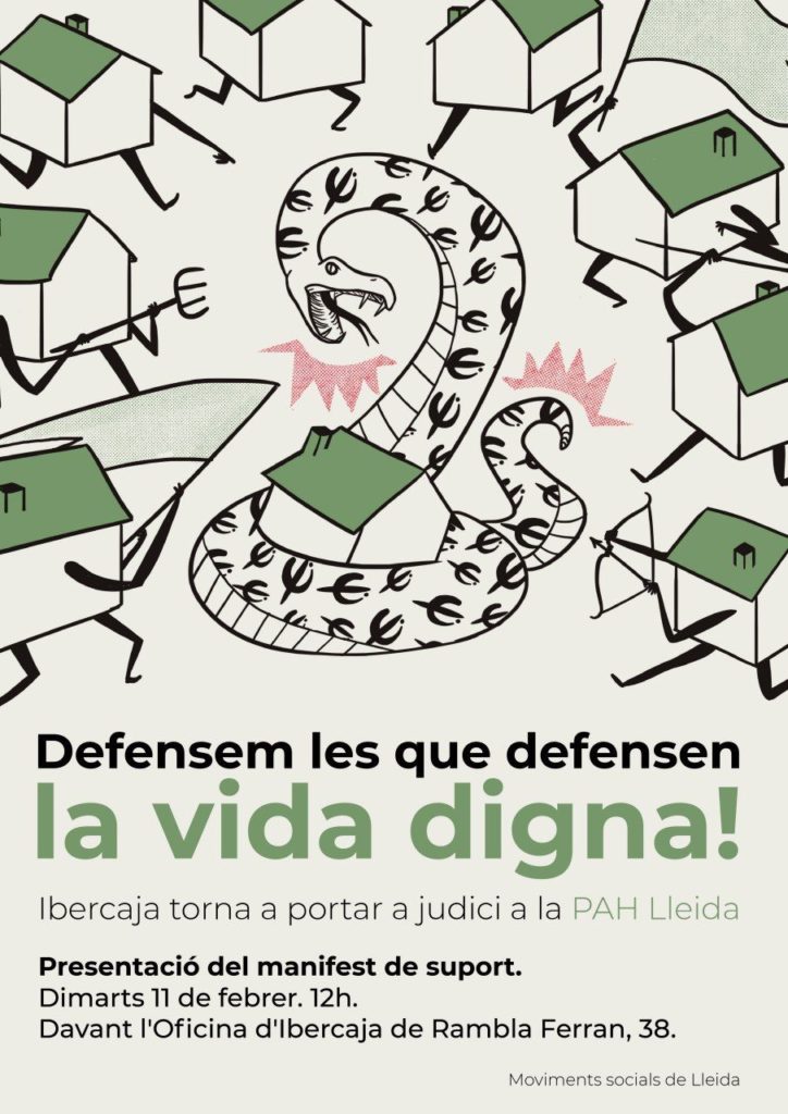 Mañana 13 de febrero, se quiere hacer sentar en el banquillo a la PAH de Lleida por una denuncia de Ibercaja, que busca criminalizar a las personas y familias vulnerables que no tienen garantizado su derecho a la vivienda ‒víctimas de todo tipo de abusos mientras las instituciones que tenían que rescatar sus derechos se han ocupado más bien de rescatar los intereses de la banca‒, así como criminalizar a los ciudadanos y ciudadanas activistas por el derecho a la vivienda, que de forma totalmente altruista han invertido su tiempo y esfuerzos en hacer frente a esta situación de injusticia social.