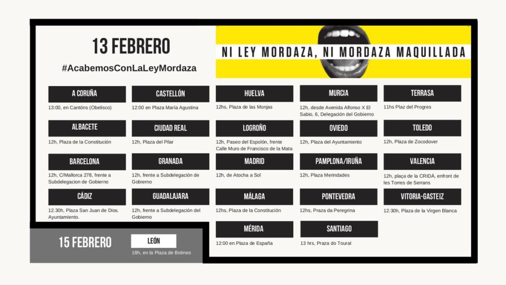 Tenemos muchos motivos para salir a la calle a exigir que no queremos ninguna mordaza que vulnere nuestros derechos y libertades. Hagamos que el 13 de febrero seamos miles en las calles dejando claro que queremos acabar de una vez por todas con las mordazas.