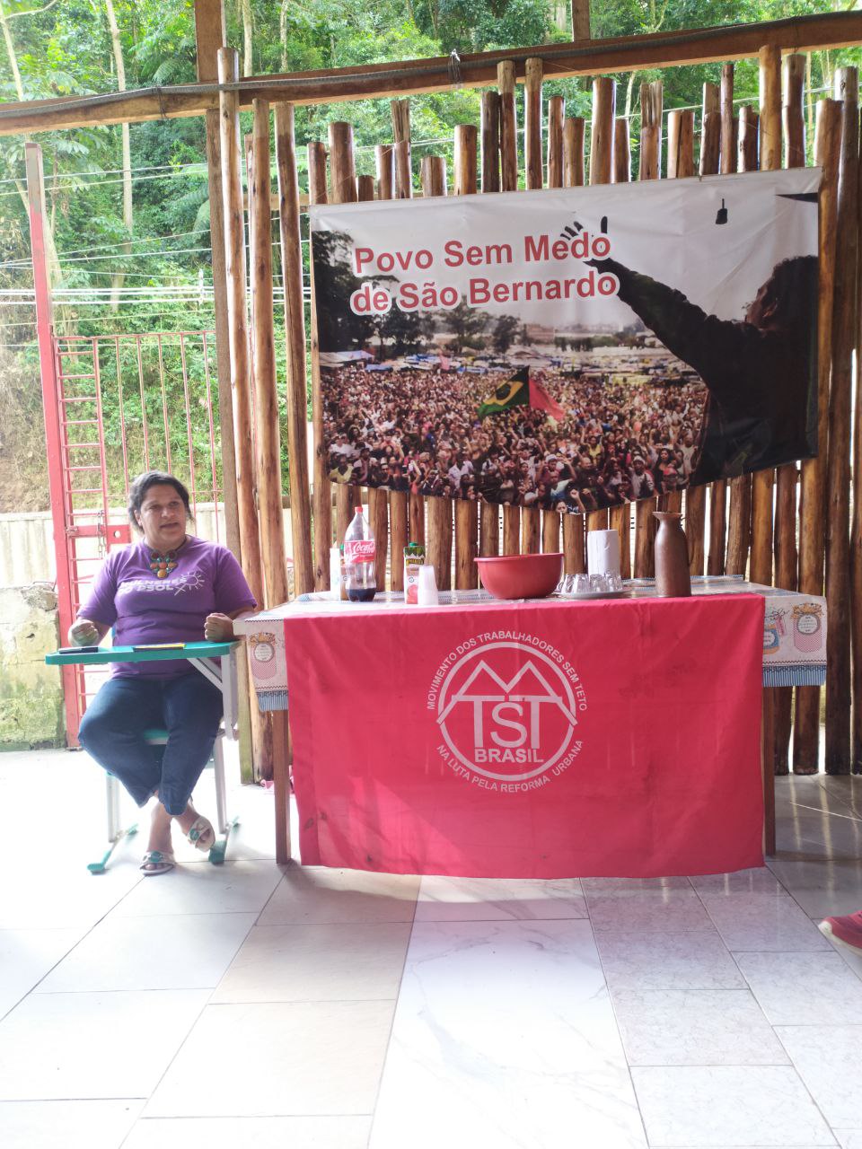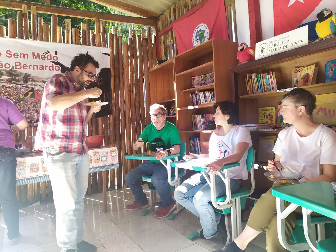 De ahí salimos de São Paulo para comer en la ciudad de São Bernardo do Campo, en una cocina solidaria del Movimiento de Trabajadores Sin Techo (MTST). Ahí nos contaron que el MTST nació en 1996, que para ellas “sin techo” es cualquier persona que tenga que dedicar más del 30% de sus ingresos a pagar la vivienda, y que su estrategia es ocupar terrenos públicos (o privados de propietarios que tienen grandes deudas con el Estado), para exigir que se construyan viviendas. En 2017 conocieron en Argentina la experiencia de las cocinas populares, empezaron a implantarlas en Brasil y con la pandemia se convirtieron en una gran apuesta del movimiento, hasta tener 34 cocinas por todo Brasil. Cada mediodía reparten comidas gratuitas para la comunidad, y el espacio de la cocina se convierte también en un espacio de encuentro, formación y cuidados; en una de sus cocinas, por ejemplo, organizan una consulta ginecológica gratuita los fines de semana.