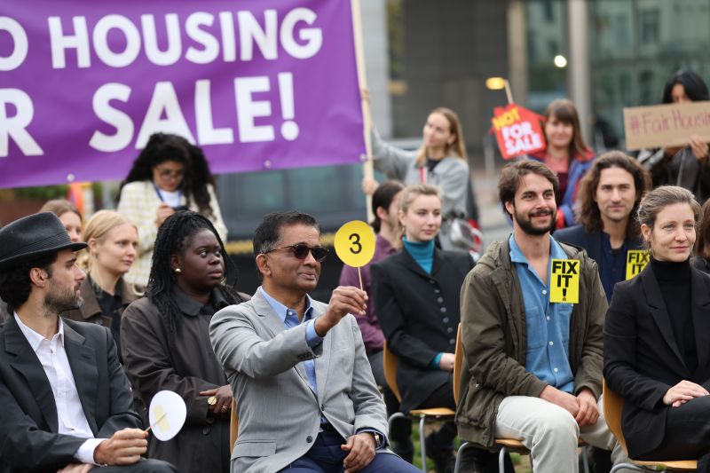 A medida que la consulta pública sobre el Plan Europeo de Asequibilidad de la Vivienda llega a su fin esta semana, las ONG de toda Europa se reúnen en una subasta ficticia fuera del Parlamento Europeo para pedir a los responsables políticos de la UE que no vendan el derecho de las personas a la vivienda, sino que entreguen un plan que garantice una vivienda decente, asequible y energéticamente eficiente para todas.