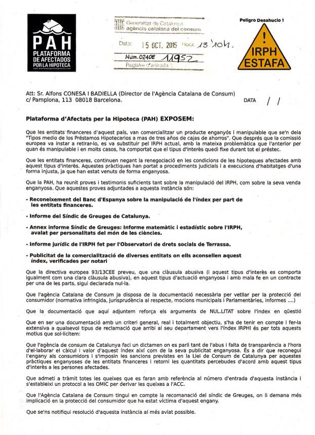 Instancia individual de la PAH para presentar en Consum referente ala estafa del IRPH -