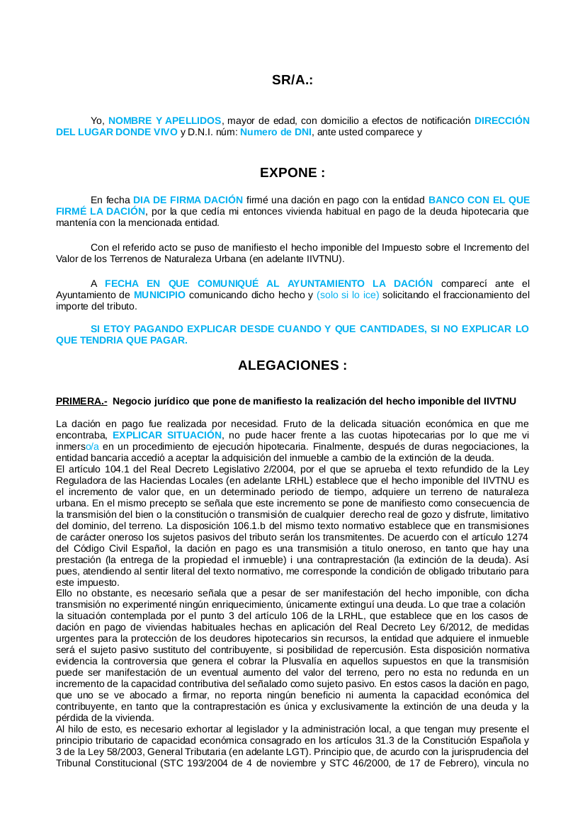 - Solicitud Exención Plusvalía en caso de Dación en Pago Kit fiscal – Modelo 1