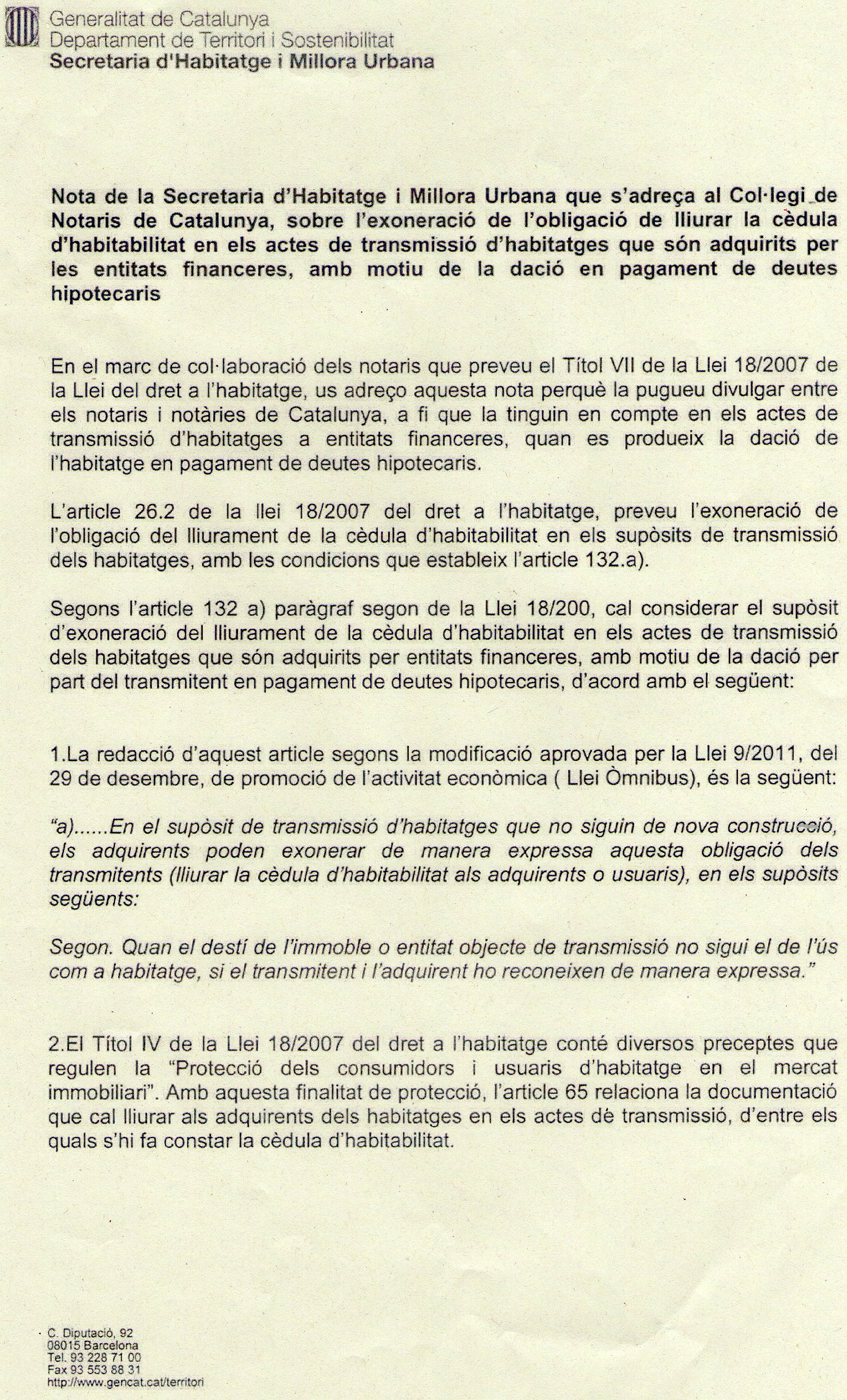 Nota Introductoria (solo para Catalunya): aunque la mayoría de Entidades Bancarias la piden, la obtención de la cédula de habitabilidad esta no es necesaria para la firma de la dación en pago. En aquellos casos en que no se dispone de cédula, con esta carta informamos al banco de esto y le pedimos que nos exima de su entrega para la dación en pago.