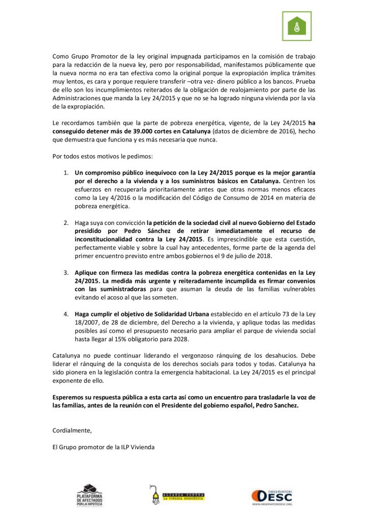 La Plataforma de Afectadas por la Hipoteca (PAH), la Alianza contra la Pobreza Energética (APE) y el Observatorio DESC (ODESC), impulsamos una Iniciativa Legislativa Popular (ILP) Habitatge de medidas urgentes para hacer frente a la emergencia en el ámbito de la vivienda y la pobreza energética, que recibió un gran apoyo social -cerca de 150.000 firmas- y fue aprobada por unanimidad en el Parlamento de Cataluña en julio de 2015. ¡Había nacido la Ley 24/2015! Una ley que quería garantizar una segunda oportunidad a las familias, que paró miles de desahucios, que corresponsabilizaba a la banca y a los grandes propietarios, que asegura realojos adecuados y para, a día de hoy, miles de cortes de suministro. Nos consta que así lo consideran también